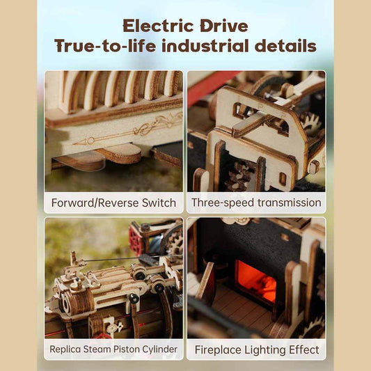 Steam Engine Wooden Locomotive Model — Red/Natural Wood, 3-Speed Collectible
