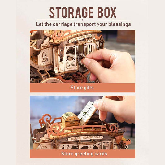 Stagecoach Mechanical Music Box — Beige/Brown Laser-Cut Wood, Wind-Up, Squirrel Figure