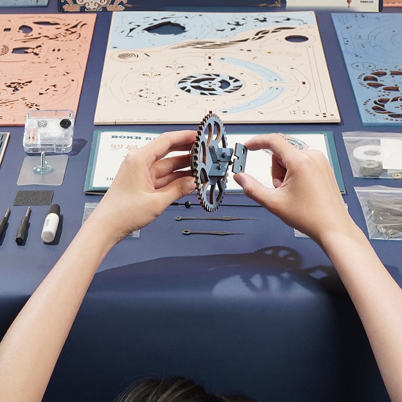 The interlocking gear motifs and precision-cut Roman numerals offer clear visual rhythm without extra fuss. This is a hands-on project made for someone who enjoys focused building and the calm of a finished object on the wall. We stand behind the product with a 30-day money-back guarantee, and we plant a tree for every purchase as part of our eco program.