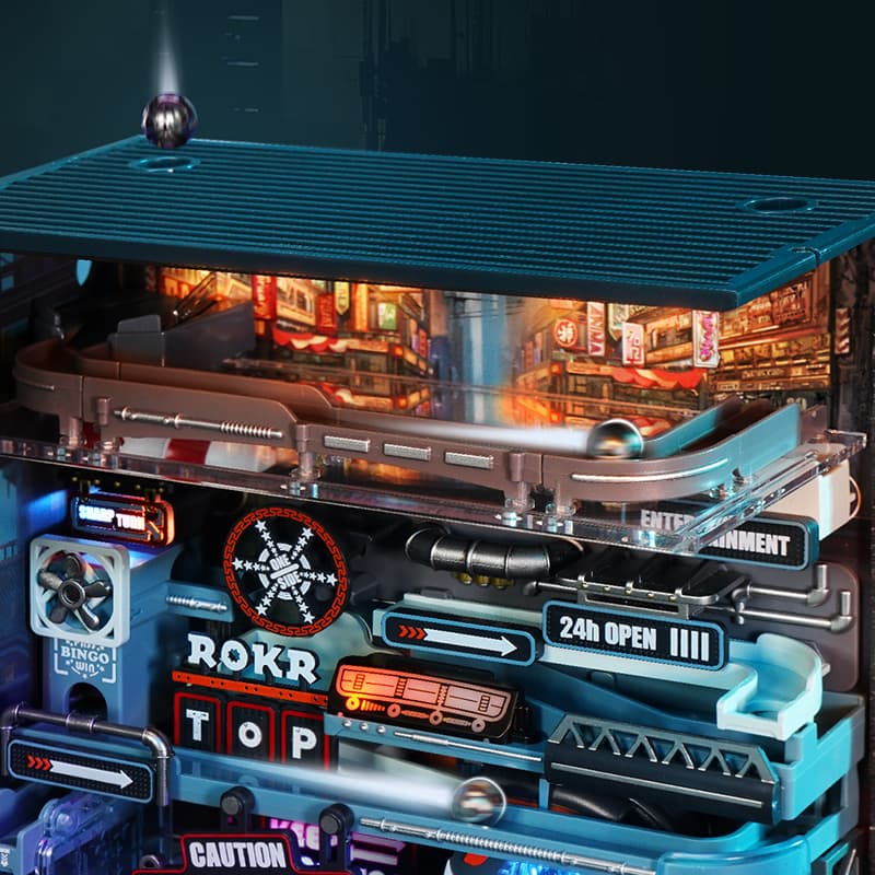 Main City Marble Run invites you to build and watch a mechanical journey where marbles route through an intricate network of tracks and moving parts. The model combines glossy, durable plastics and metallic components to create dynamic motion across loops, funnels, curves, direction changers, slides and tunnels. The multicolor palette—blue, red, orange and yellow—adds visual rhythm as each marble travels from start to finish.