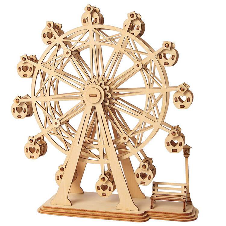 Bring a little fairground charm to your desk — and the quiet satisfaction of building it yourself. This Desktop Ferris Wheel wooden model kit is a hands-on project that finishes as a small, rotating display piece. The kit uses laser-cut plywood parts that slot together, so no tools or glue are required. The gondolas include delicate heart-shaped cutouts that add a bit of personality when the wheel turns.