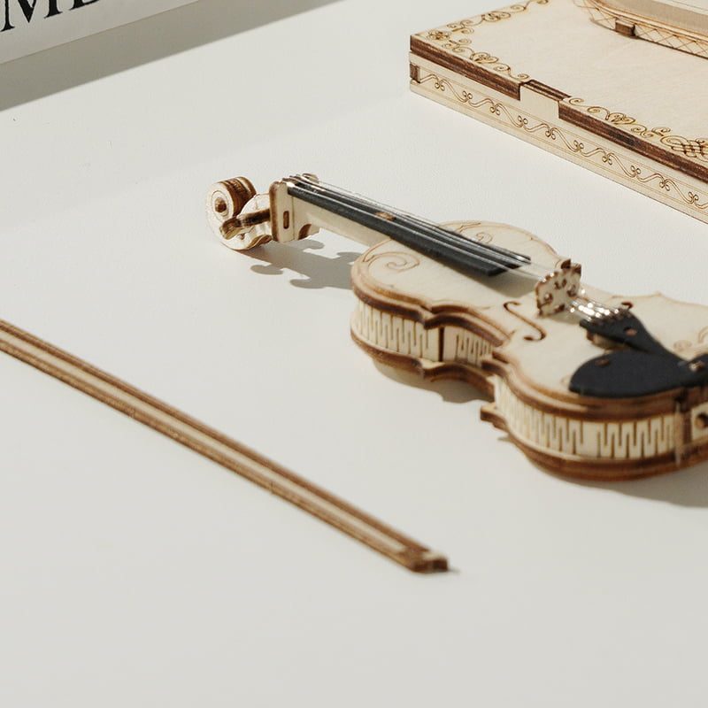 Welcome to a calm, hands-on project that celebrates music and making. This collector's replica is a miniature violin model made from plywood that shows natural wood grain and engraved f‑holes and scrollwork. It’s a satisfying build for hobbyists who enjoy detailed models and tasteful display pieces.