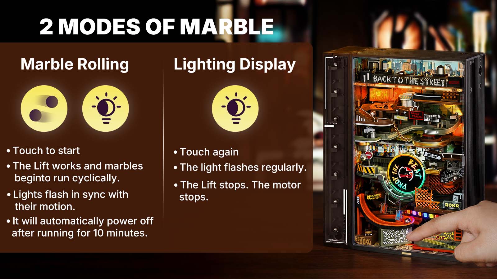 Welcome to a hands-on project that mixes mechanical play with city-style visuals. This self-assembled 3D puzzle combines layered platforms and guided pathways so marbles travel through a tabletop run that echoes Detroit street scenes of the 1990s. The model uses a mix of rigid and composite materials and is printed in a palette of black, red, yellow, orange and green, with street-sign graphics and graffiti-style artwork. Sound-reactive light effects respond to ambient audio for a lively display.